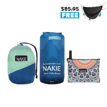 • Studio shot showcasing Nakie's hammock and puffy blanket, highlighting their combined comfort and versatility for outdoor relaxation and camping adventures